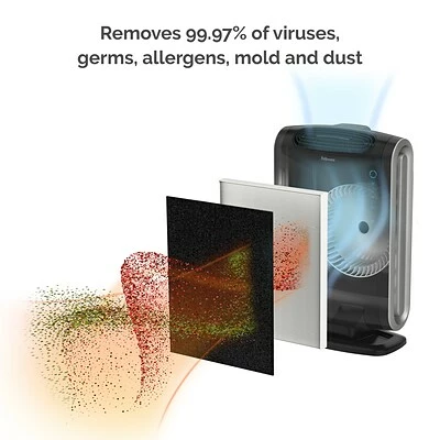 The Fellowes® AeraMax® 290 Air Purifier uses 4-stage hospital-type filtration to effectively purify air in large rooms 300 – 600 square feet. The AeraSmart™ Sensor monitors the air quality and automatically adjusts the fan speed to keep your air purified with ultra-quiet operation. A True HEPA filter with AeraSafe™ antimicrobial treatment safely removes 99.97% of airborne particles as small as 0.3 microns. Backed by a 3-year manufacturer limited warranty.