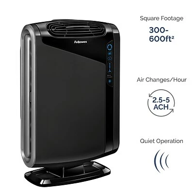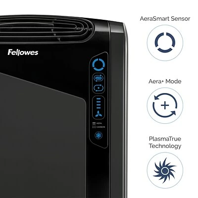 The Fellowes® AeraMax® 290 Air Purifier uses 4-stage hospital-type filtration to effectively purify air in large rooms 300 – 600 square feet. The AeraSmart™ Sensor monitors the air quality and automatically adjusts the fan speed to keep your air purified with ultra-quiet operation. A True HEPA filter with AeraSafe™ antimicrobial treatment safely removes 99.97% of airborne particles as small as 0.3 microns, including viruses, germs, pollen, ragweed, mold spores, and other allergens, while a carbon filter removes odors and captures large airborne particulates. AeraMax PlasmaTrue™ Technology is an optional setting that utilizes ionization to help safely remove airborne pollutants. AeraMax Air Purifiers also features Aera+™ Mode for 50% more air exchanges during allergy and cold/flu seasons. Backed by a 3-year manufacturer limited warranty.